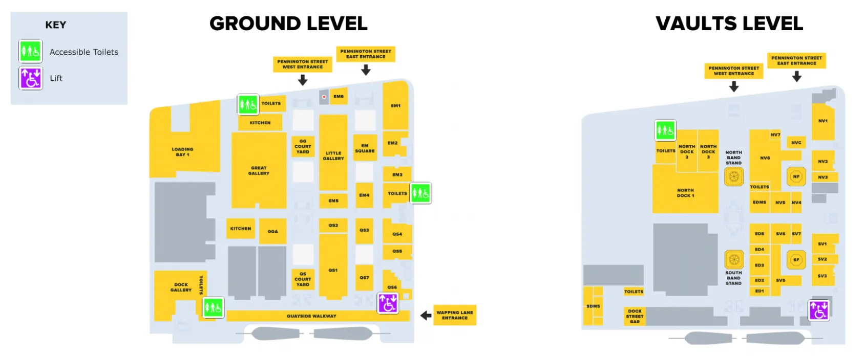The accessible toilet facilities (green) and lifts (purple) are detailed on the map below. Which facilities are in use will depend on the location of the event. If you require the use of these facilities, please reach out to the event organiser and also copy in access@tobaccodocklondon.com, we will be able to clarify which facilities are in use for your event.